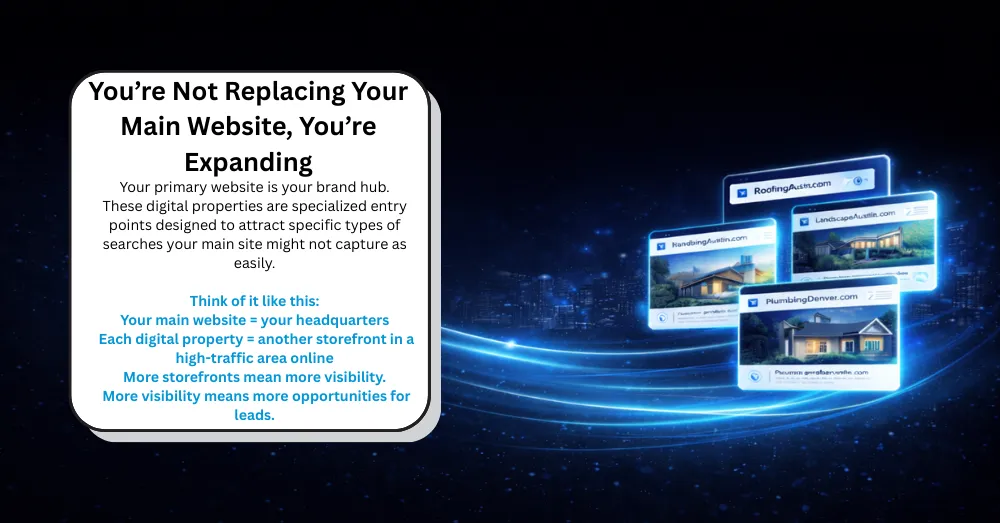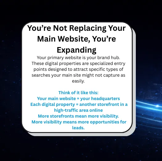 No. These are additional lead funnels. Think: more entry points, more visibility, more chances to win search. Your current site can only rank for so many things. This is an opportunity to try to focus on additional lead streams.
