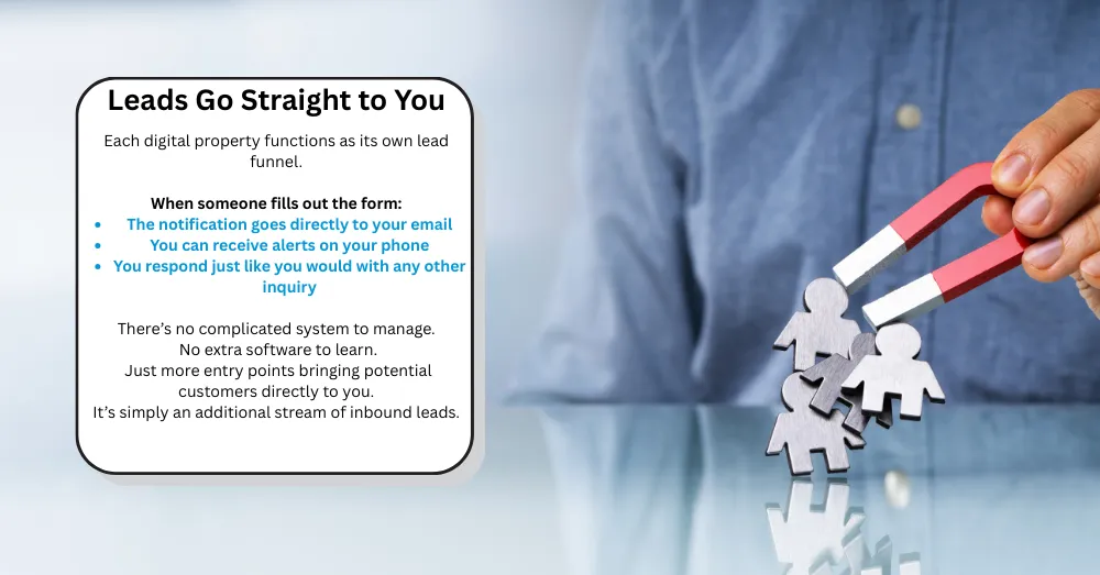 We can help with purchasing your domains, should you not have them, hosting for the sites, and help in setting your new lead generation website up for you. Beginning your Digital Real Estate journey!